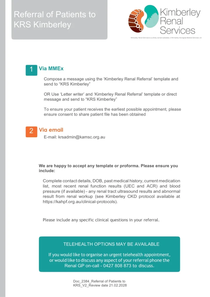 Kimberley Renal Services (KRS) is a wholly owned subsidiary of Kimberley Aboriginal Medical Service Ltd (KAMS), established to deliver high-quality kidney health care across the Kimberley.