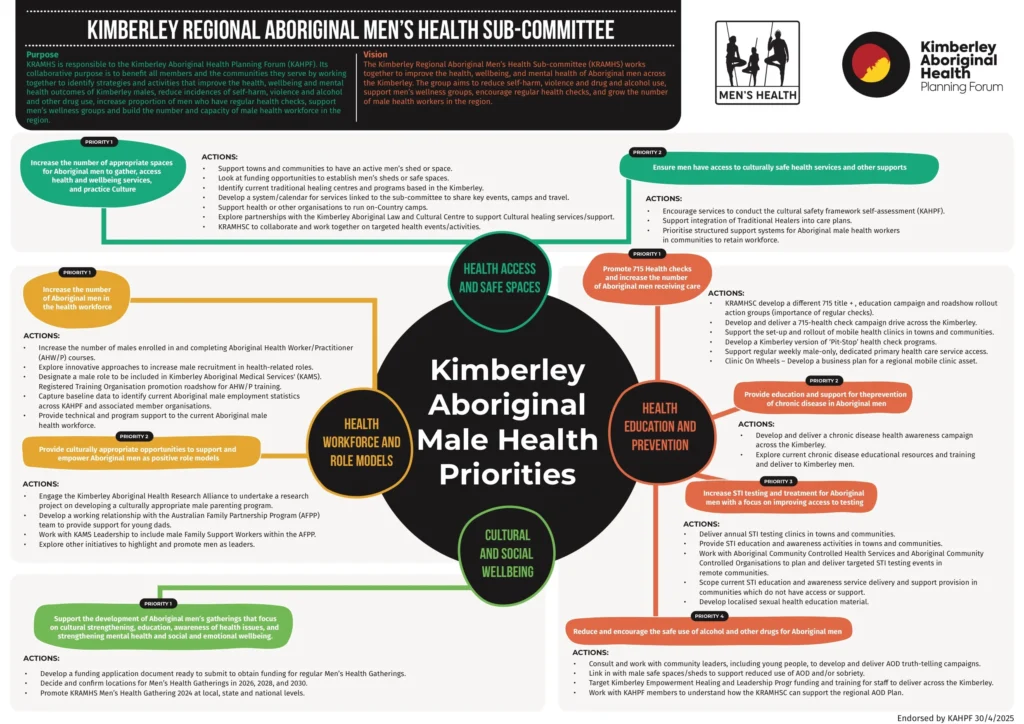 The Men’s Health Program supports the health and wellbeing of Aboriginal men across the Kimberley by providing advocacy and coordination on improving health care practices for men.